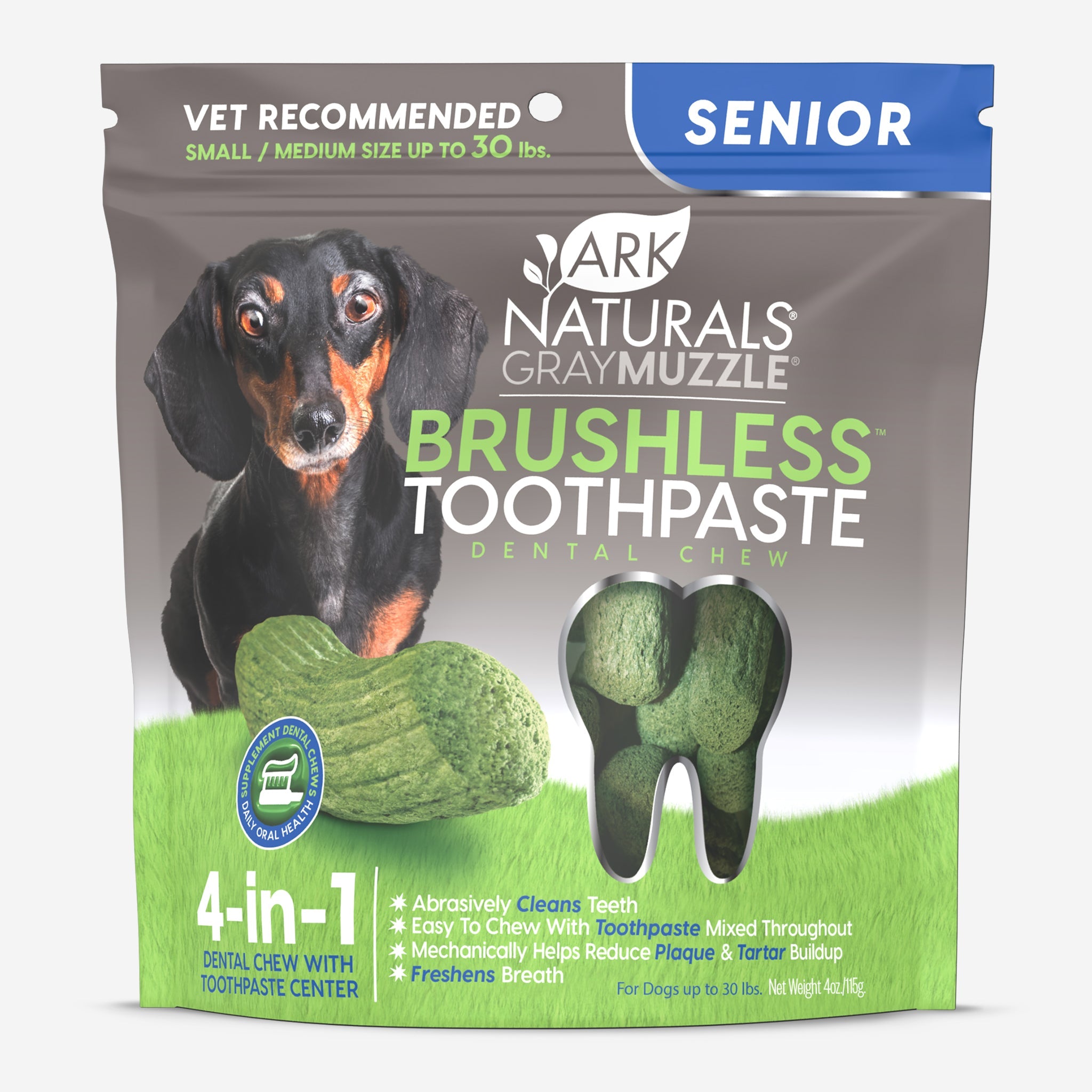 Gray Muzzle Brushless Toothpaste™ has a light, airy, and crispy texture that is great for older dogs with missing teeth and more delicate gums. These delicious chews have our active ingredient toothpaste mixed throughout to clean teeth just as effectively as our original formula. Plus, our proprietary blend has a high dose of active ingredients that are lower in fat and sodium to fit into special senior diets.