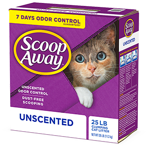 Get instant odor control with Scoop Away. Scoop Away Clumping Unscented Cat Litter is designed to handle the most extreme litter box odors for up to seven days. This clumping clay is a dust-free scooping litter that forms tight clumps to help make dealing with the cat box fast and easy. Plus, the odor fighting antimicrobial agents on the litter help eliminate odors from urine, feces, and bacteria on contact, while a paw-activated fresh scent is released every time your kitty uses the box. Scoop Away litter works so well, it is like having a fresh litter box every time you scoop!