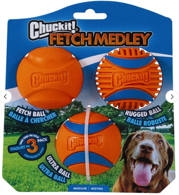 Give your dog options during a game of fetch with Chuckit!s Fetch Medley Gen 3. This medley of premium fetch balls includes the classic Fetch Ball, the popular Ultra Ball, and the new Rugged Ball. Designed just for fetch, the classic fetch ball features a high bounce when thrown that helps keep dogs engaged in play. The number 1 selling Ultra Ball is designed to have high buoyancy and high durability for land or water play. The new Rugged Ball is designed for rough play and has unique ridges that make it easy to grab and help keep teeth clean. Sold in a pack of three, each ball is sized medium (2.5" diameter) and can be used with any medium Chuckit! launcher. Your dog will love the variety of fetch balls you to choose from.