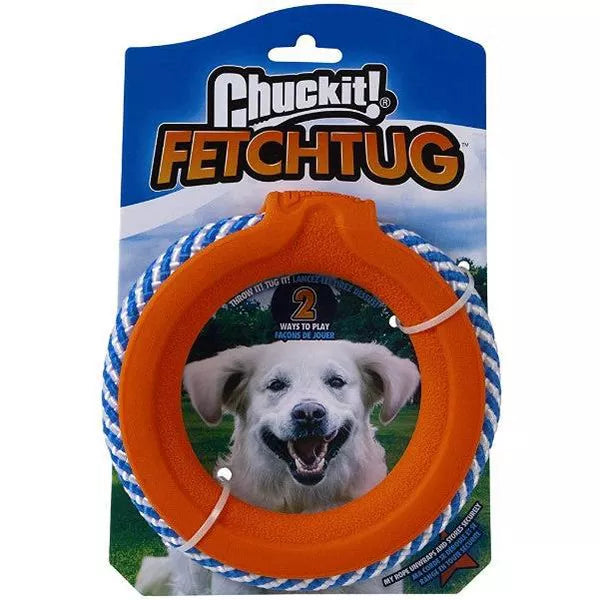 Throw it! Tug it! There are 2 ways to play with the Chuckit! Fetchtug! When thrown with the RingChaser, the unique topspin-infused action causes the Fetchtug to roll on the ground just like the real game, engaging a dog's natural chase instinct. When fetch is over, undo the self-storing rope tug for bond-building games of tug-o-war. Designed to withstand the roughest of tuggers and multiple games of fetch, the durable 2-in-1 Fetchtug will quickly become a dog's favorite new fetch toy.