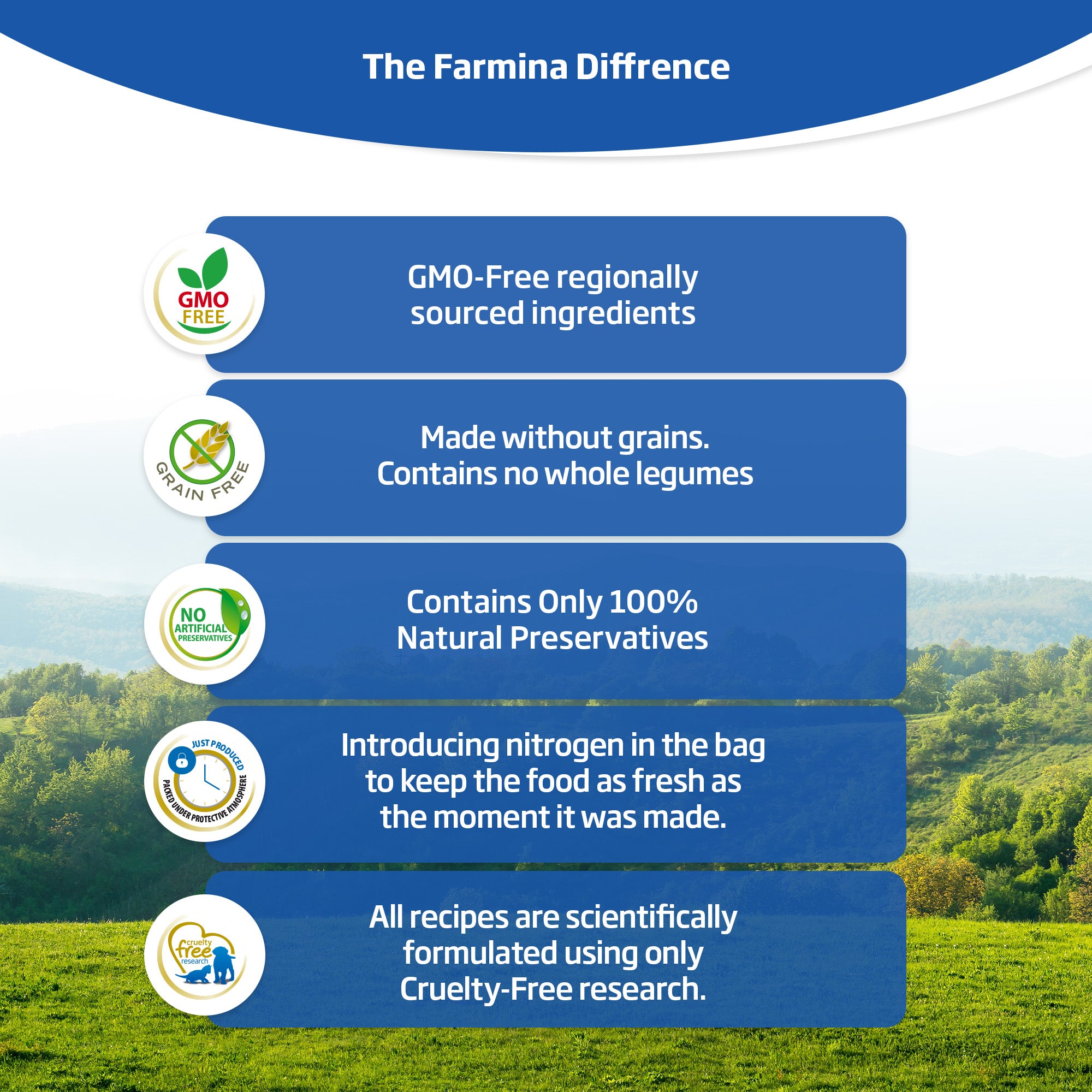 Every Farmina food is made with the best ingredients with the correct amounts of protein, fats, limited carbohydrates and advanced long life vitamins and minerals. The Natural & Delicious Grain-Free formulas are comprised of 70% animal ingredients (pre-cooking weight) and 30% vegetables, fruits, vitamins and minerals. Delicious Lamb & Blueberry flavor contains no peas, legumes, meals or by-products for nutrition you can feel great about.