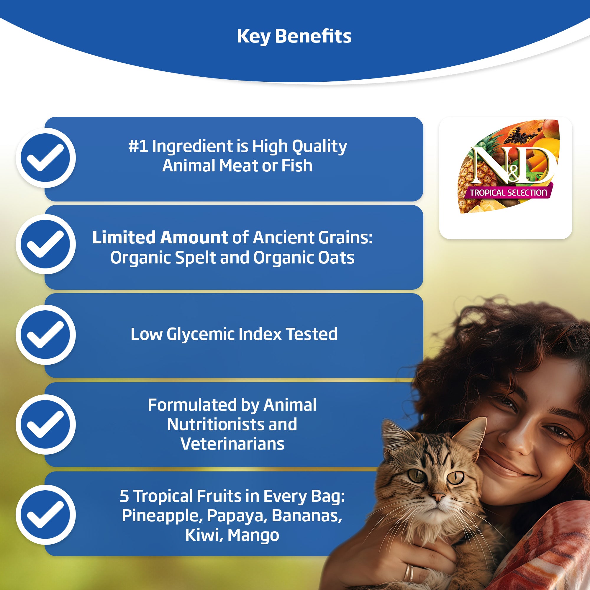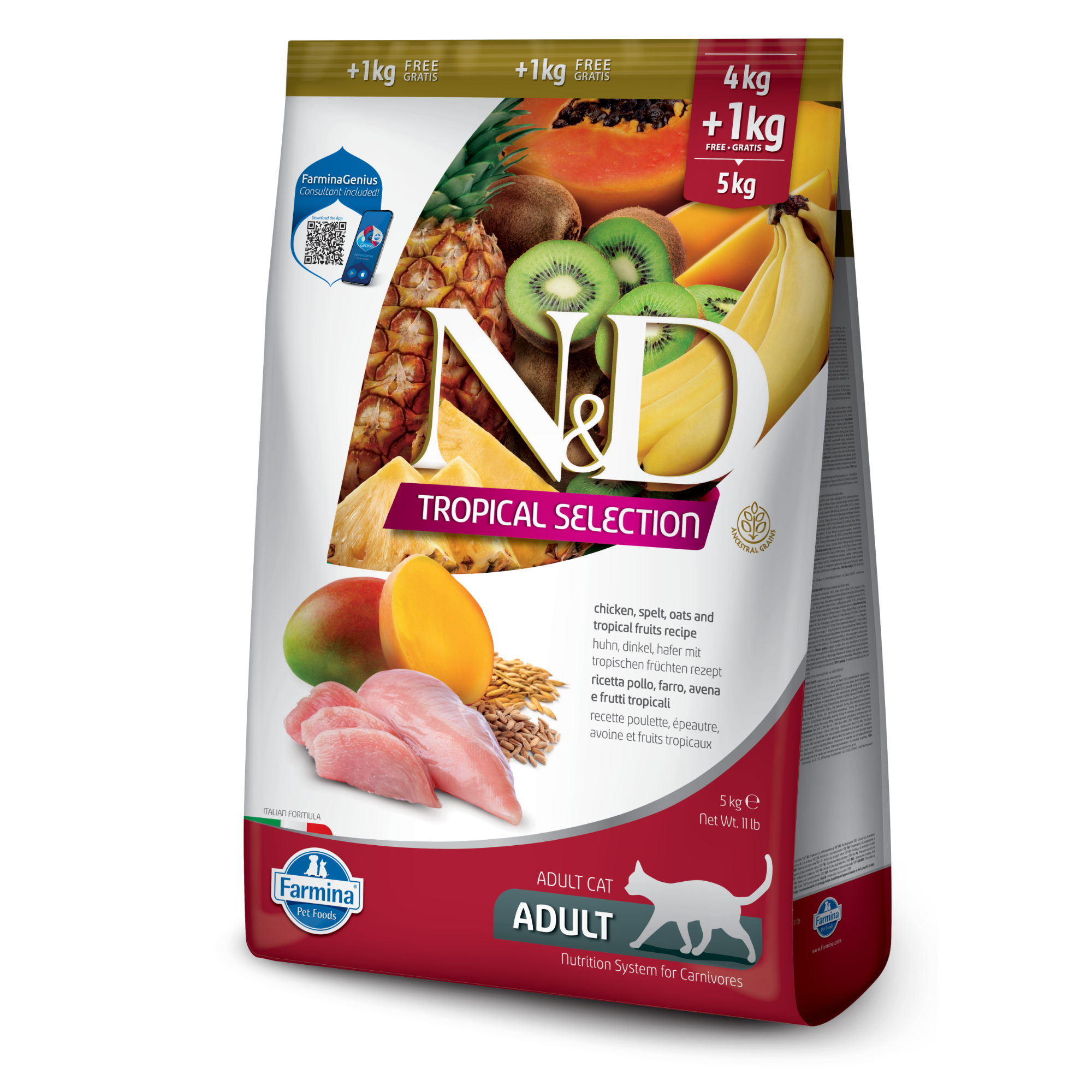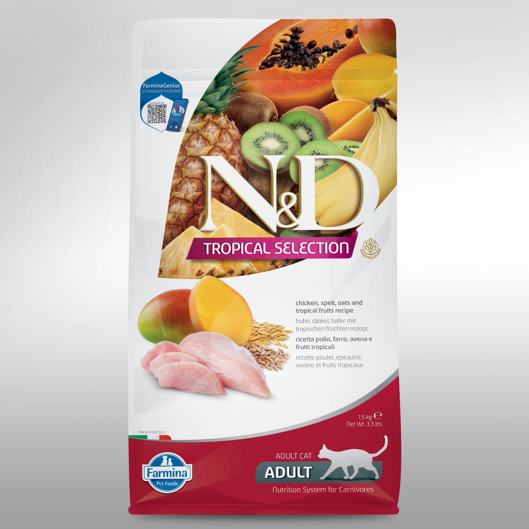 N&D Tropical Selection Chicken, Spelt, Oats and Tropical Fruits Feline recipe is formulated to meet the nutritional levels established by the AAFCO Cat Food Nutrient Profiles for all life stages.
