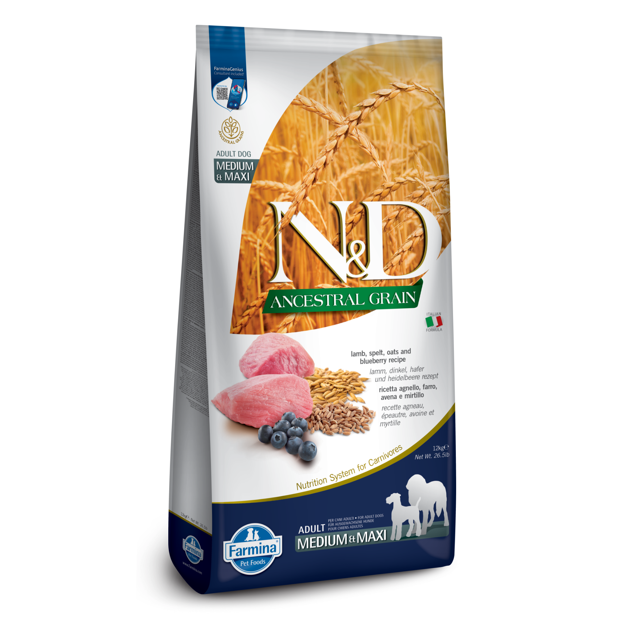 Farmina N&D Dog Ancestral Grain Adult Medium & Maxi Lamb and Blueberry 26.4lb