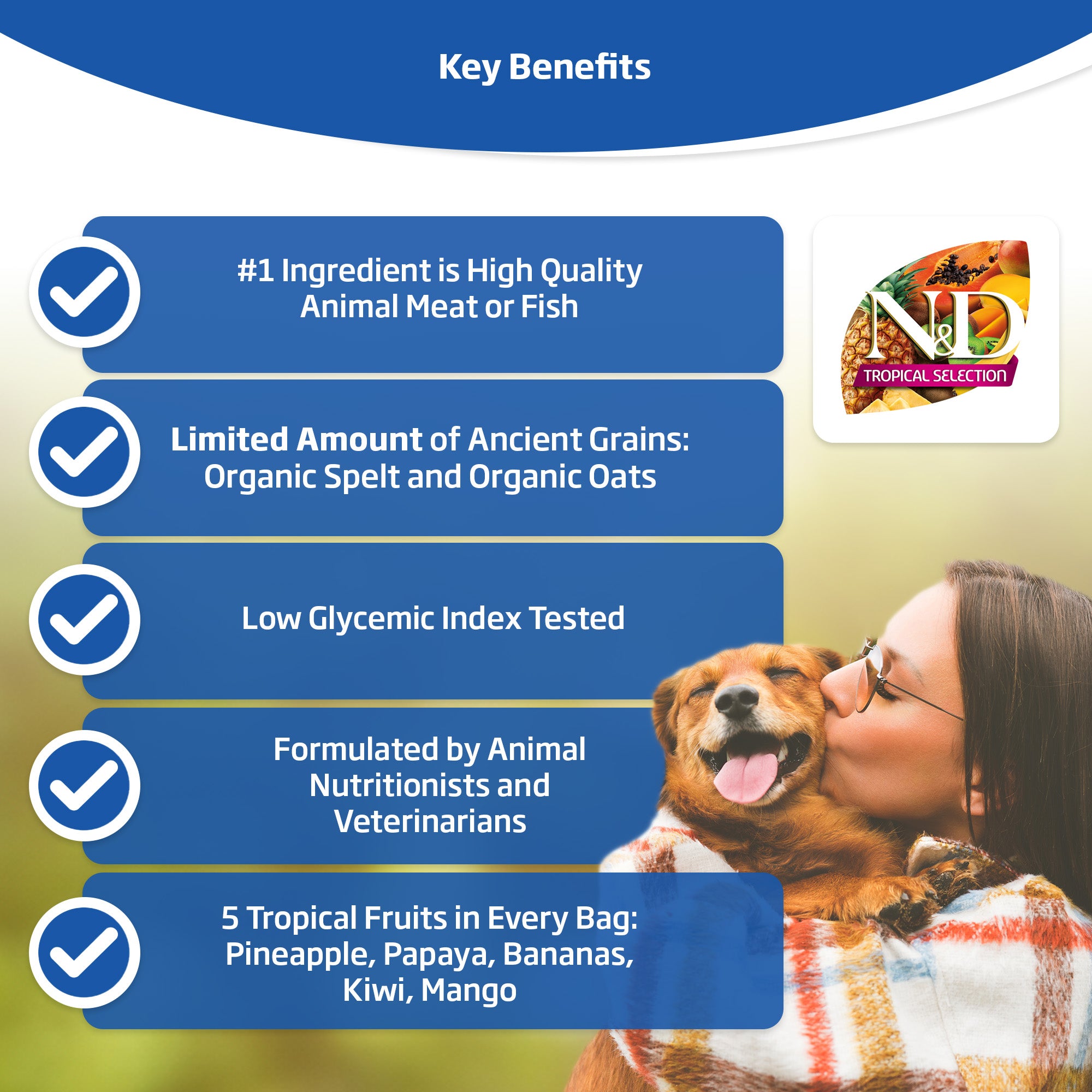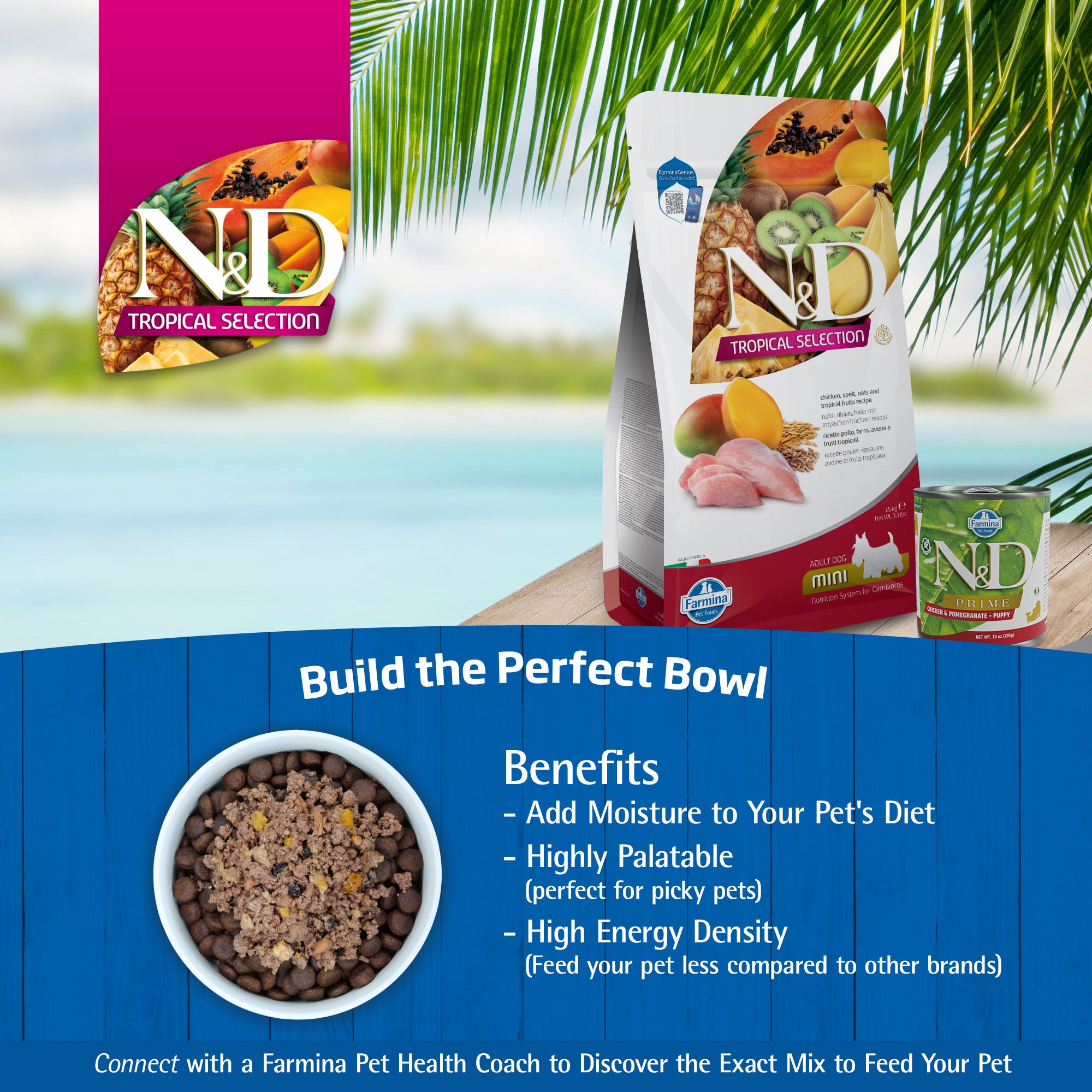 N&D Tropical Selection Canine Chicken, Spelt, Oats and Tropical Fruits recipe is formulated to meet the nutritional levels established by the AAFCO Dog Food Nutrient Profiles for maintenance.