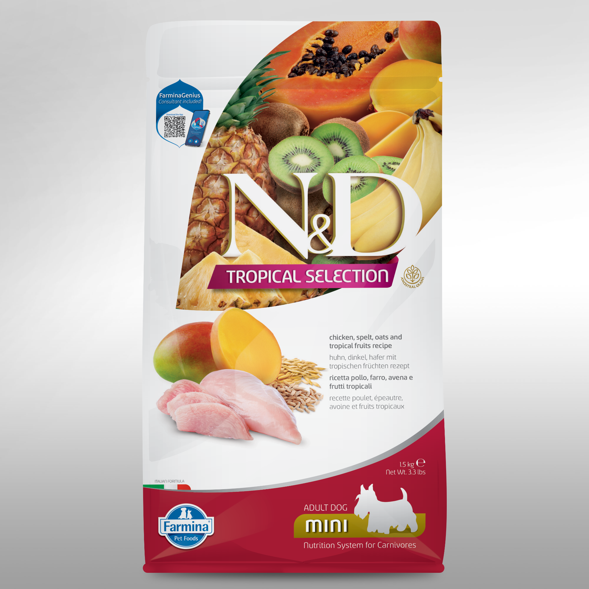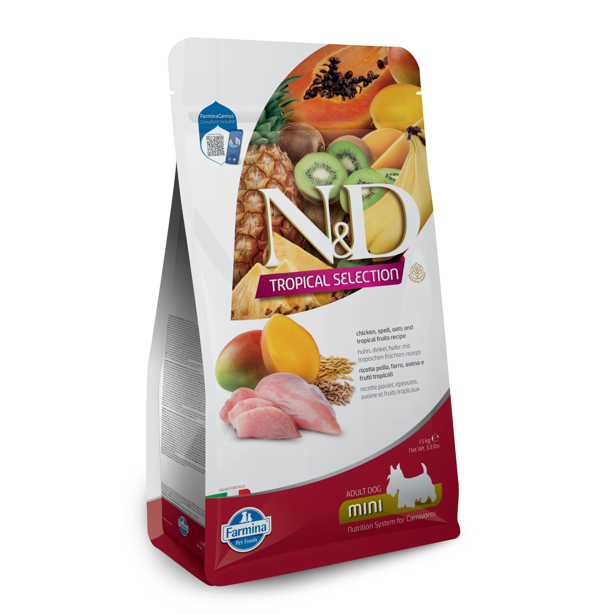 N&D Tropical Selection Canine Chicken, Spelt, Oats and Tropical Fruits recipe is formulated to meet the nutritional levels established by the AAFCO Dog Food Nutrient Profiles for maintenance.