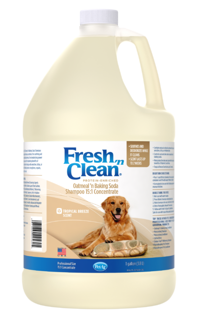 The preferred choice of groomers, Fresh ‘n Clean Oatmeal ’n Baking Soda Shampoo is ideal for dogs with dry, itchy and sensitive skin. The natural soap-free formula is 95% plant-derived and combines the soothing qualities of colloidal oatmeal with the odor-controlling power of baking soda. Infused with protein, vitamin E and aloe, this shampoo repairs and moisturizes for a healthy, manageable coat. The 15:1 concentration saves on shipping costs with more washes per bottle. And the Fresh ’n Clean signature, long-lasting fragrance keeps your client’s dog smelling fresh up to two weeks.