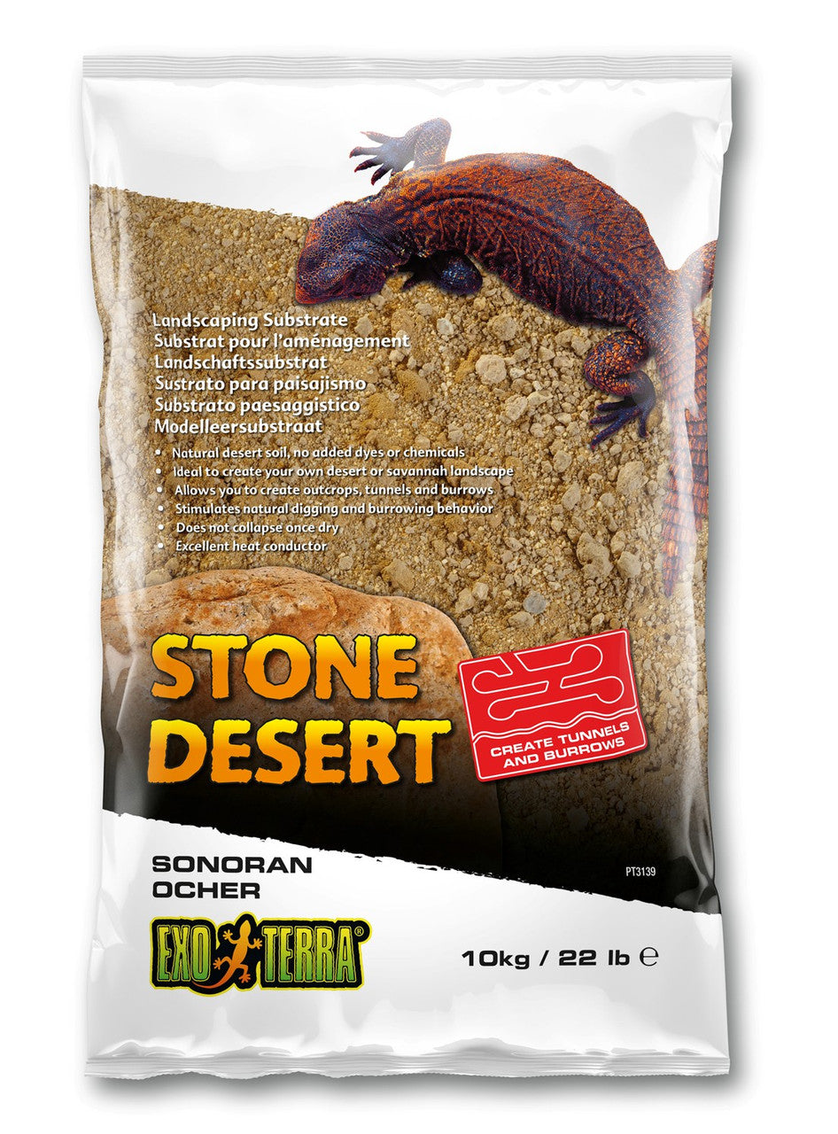 The Exo Terra Stone Desert mimics the natural soil found in arid regions, like deserts or savannahs. Most desert soils are not purely sand-based but rather a combination of sand, decomposed granite and clay resulting in interesting and sometimes colorful rock formations. Exo Terra's Stone Desert allows you to create your own desert or savannah landscape, including cool-humid burrows as well as warmer elevated basking areas. The cool-humid burrows allow your reptiles to absorb the much needed moisture via their skin while sleeping or hiding, while the warmer elevated basking areas help your reptiles to thermoregulate by offering various important temperature gradients.