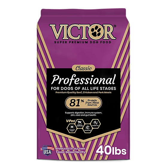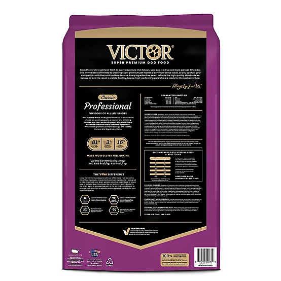 VICTOR PROFESSIONAL for Dogs is formulated to meet the nutritional levels established by the AAFCO Dog Food Nutrient Profiles for All Life Stages, except for the growth of large size dogs (70 lb. or more as an adult).Â