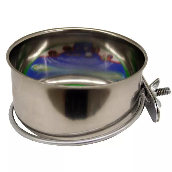 Stainless Steel Coop Cups with Steel Clamp Holders has a bolt clamp attachment and help these cups fit securely to the side of the cage. Made of rust-proof, scratch-proof, and chew-resistant stainless steel that's easy to clean. Sizes are approximate. The bracket, bolt, and wing nut are painted.