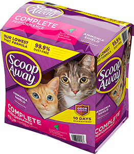 Scoop Away Complete Performance Clumping Cat Litter works to destroy litter box odors with plant extracts and Ammonia Shield technology, leaving behind a fresh, clean scent. This 99.9% dust-free clay formula forms ultra strong clumps to help prevent stinky crumbles from being left behind after scooping. The compact, convenient packs make the kitty litter easy to carry, pour, and store. To refresh and maintain your pal's litter box, scoop daily and top off with fresh Scoop Away Complete Performance Clumping Cat Litter.